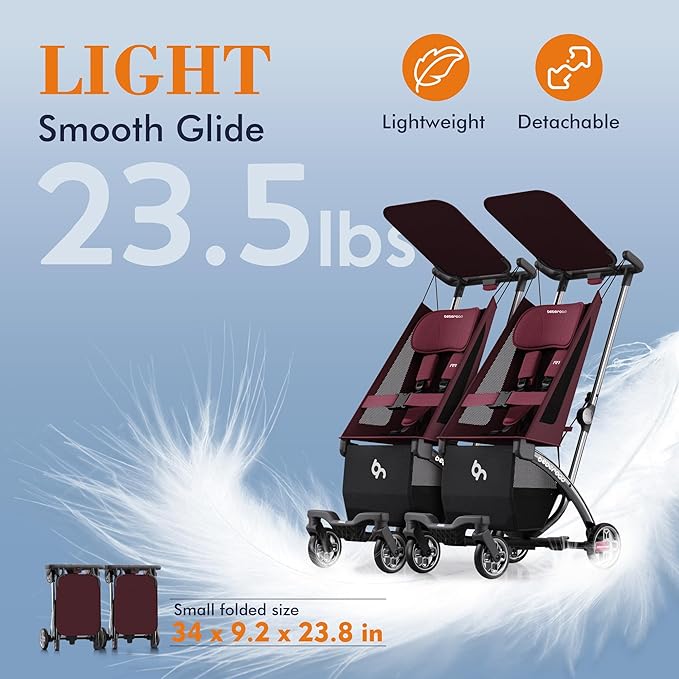 - ULTRA LIGHT TRAVEL TWIN STROLLER: The aluminum-alloy frame makes the stroller both sturdy and lightweight , weighing only 23.5 pounds, easily unfold and flexibly fits into the trunk of car. The R1 twin stroller is one of the lightest twin strollers on the market. Truly convenient for on the go, suitable for baby over 6 months.