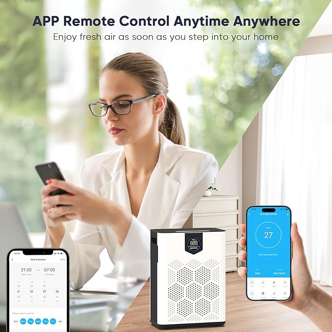 - ใ๐๐ฆ๐๐ซ๐ญ ๐๐จ๐ง๐ญ๐ซ๐จ๐ฅ ๐๐จ๐ซ ๐๐ง๐ฒ๐ญ๐ข๐ฆ๐, ๐๐ง๐ฒ๐ฐ๐ก๐๐ซ๐ใRemotely master your air purifier via our Smart Home Life app, compatible with 2.4GHz Wi-Fi, for control unhindered by time or distance. Monitor your indoor air quality in real-time, turning off/on, changing modes or fan speed, creating a schedule, using a timer, track filter usage, and reorder replacements filter. Start it when you get off work and enjoy fresh air as soon as you get home