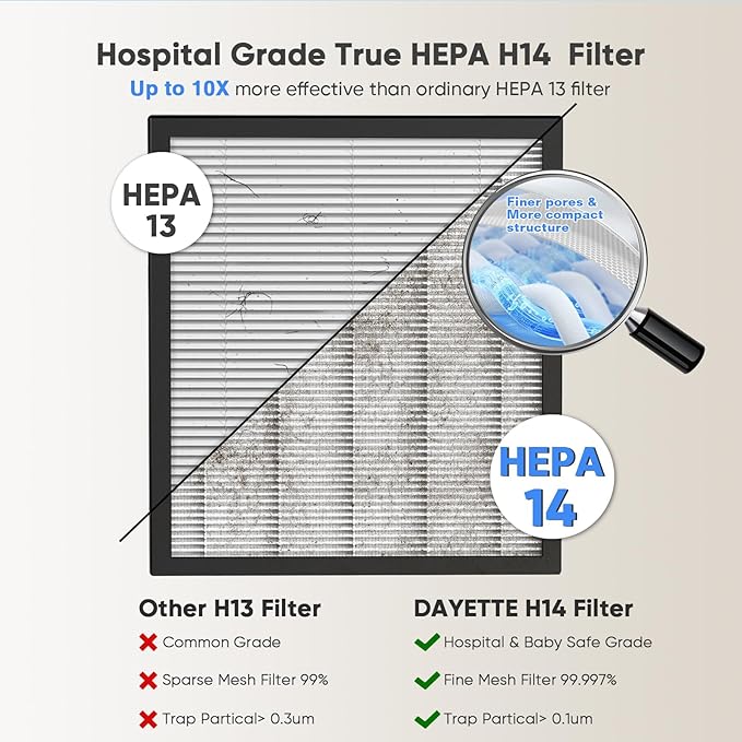 - ใ๐๐จ๐ฐ๐๐ซ๐๐ฎ๐ฅ ๐๐๐ ๐๐๐๐ ๐ ๐ข๐ฅ๐ญ๐๐ซใOur New Air Purifiers upgraded to the H14 HEPA filter, which can capture 99.997% of particles as small as 0.1 micron, more efficient and powerful than H13, combined with pre-filter, H14 HEPA filter, activated carbon filter and net filter to achieve the highest performance, such as dust, smoke, pollen, hair and odor. You can enjoy a fresher, cleaner air environment and breathe easier