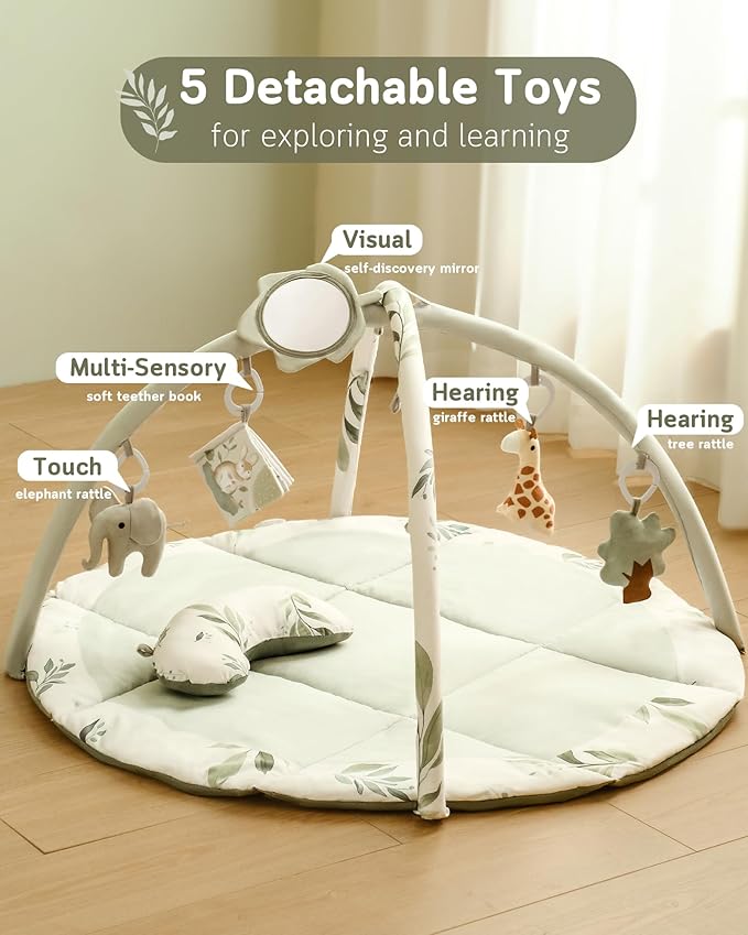 Fortella Baby Play Gym & Activity Mat, Tummy Time Mat w 5 Detachable Toys and Pillow, Large Sensory Playmat for Floor, Newborn Infant Baby Essentials Shower Gift 0-3-6-9-12 Months (Sage Green)
