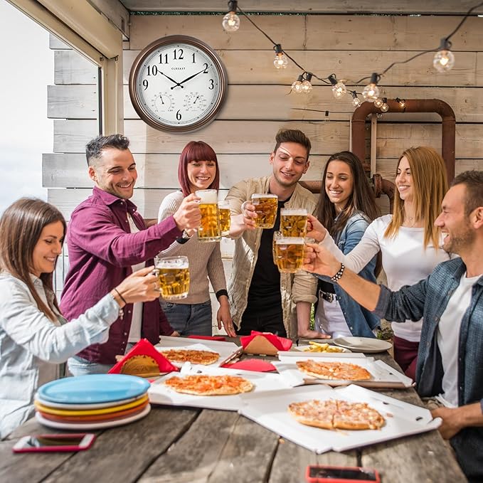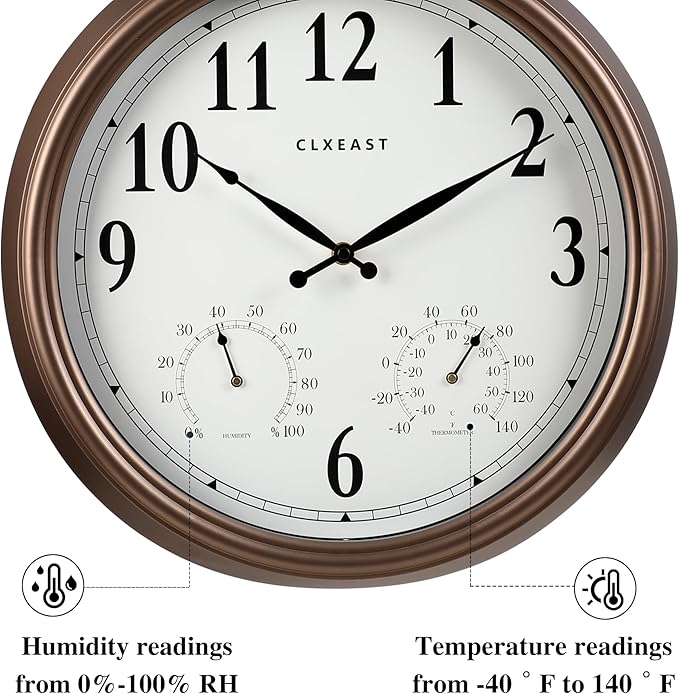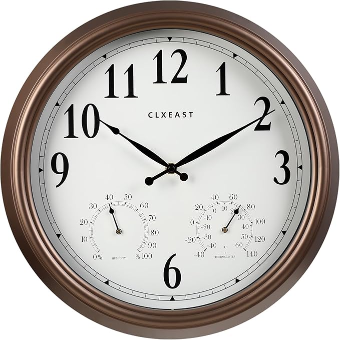 CLXEAST Indoor Outdoor Clocks Waterproof 16 Inch, Large Outdoor Clock Thermometer Combo& Hygrometer,Bronze/Dark Brown Finish,House Warming Gifts New Home