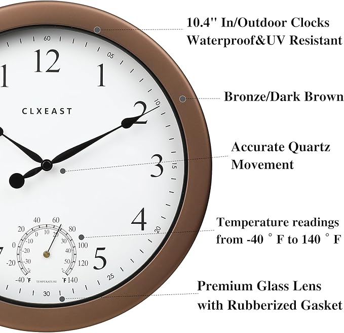 CLXEAST 10.4 Inch Indoor Outdoor Clocks Waterproof,Outdoor Clock with Temperature for Bathroom,Kitchen, Patio,Pool,Bronze/Dark Brown Finish,House Warming Gifts New Home
