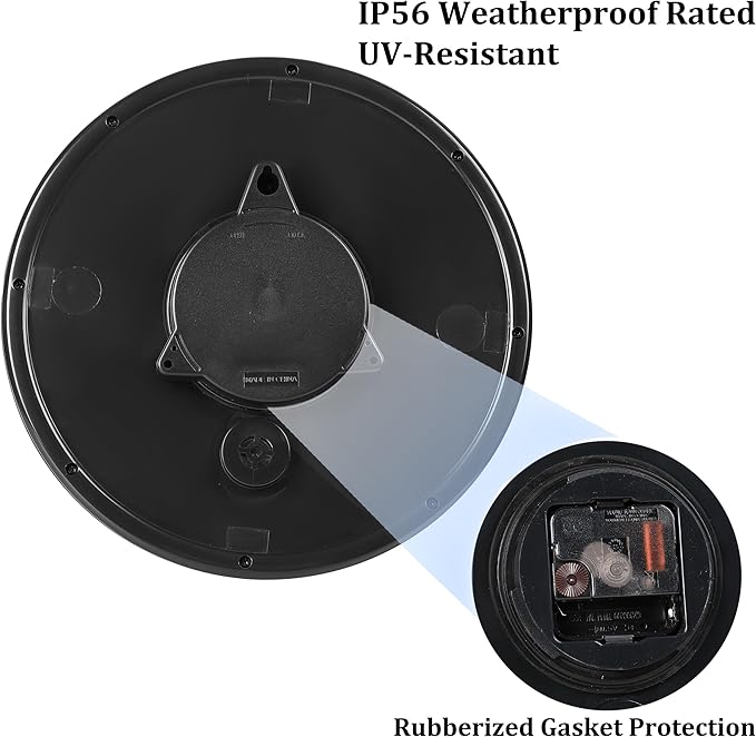 - [UV Resistant& Weatherproof In/Outdoor Clock]:This outdoor clock is crafted from solid ABS plastic and sealed rubberized gaskets,features an IP56 weatherproof rating, making it suitable for bathroom,gardens, patios, porches,pool area and other any space