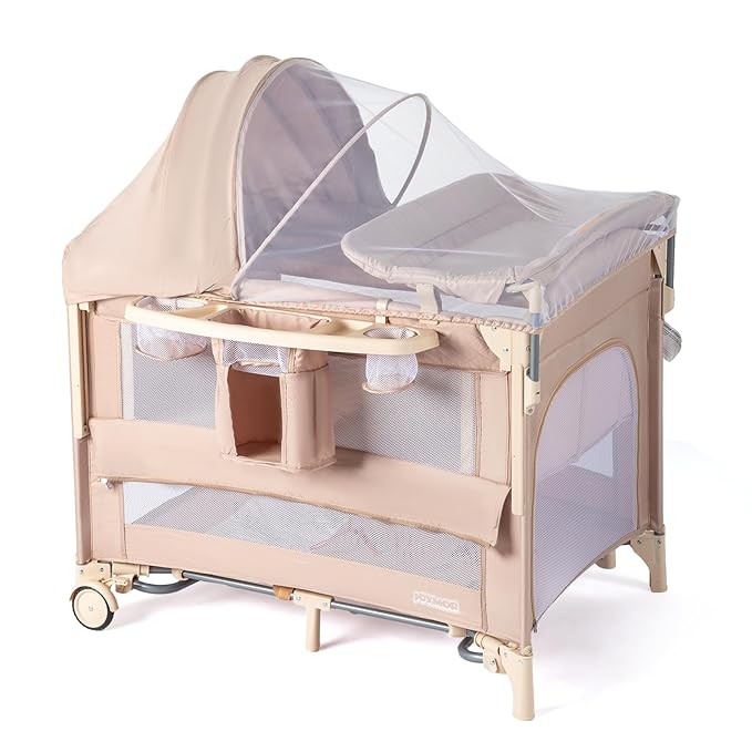 JOYMOR 9 in 1 Bedside Bassinet with Changing Table, Pack and Play with Bassinet, Convert to Rocking Baby Bed with Electric Music Center, Mosquito Net, Toy, Storage, Beige