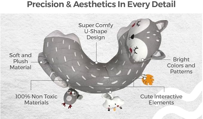 Tummy Time Pillow with 3 Detachable Sensory Toys - Infant Head Support & Neck Strengthening Mat - Soft & Breathable Baby Gym Play Pillow - Machine Washable (Gray Fox)