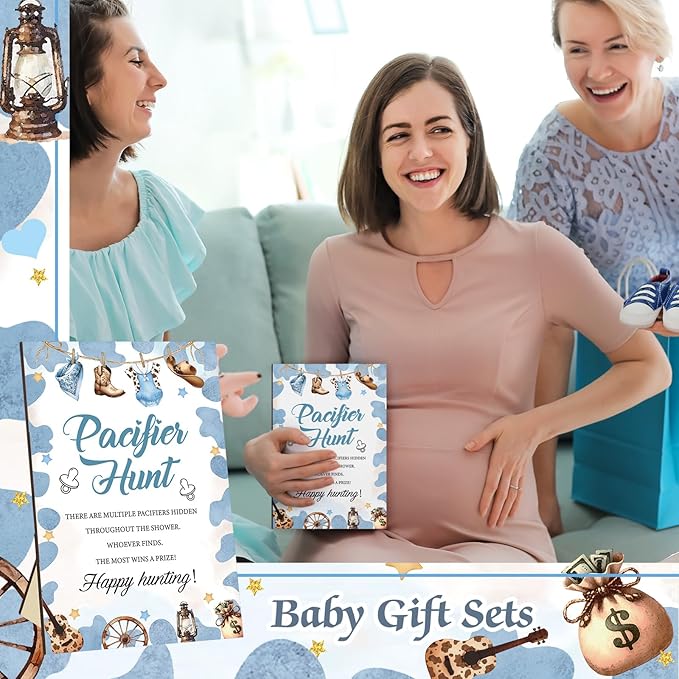 Thyle 51 Pcs Pacifier Hunt Baby Shower Games Include Hunt Sign and 50 Acrylic Pacifiers for Baby Shower Game Decoration Gift Sets Gender Reveal Party Decor(Cowboy)