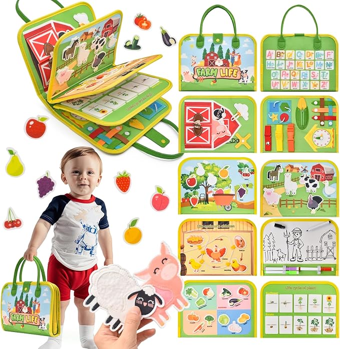 Toddler Busy Board Montessori Toys, Sensory Board Busy Book for Toddlers 1-3 Birthday Gifts - Preschool Learning Life Skills, Farm Green, 8 Pages