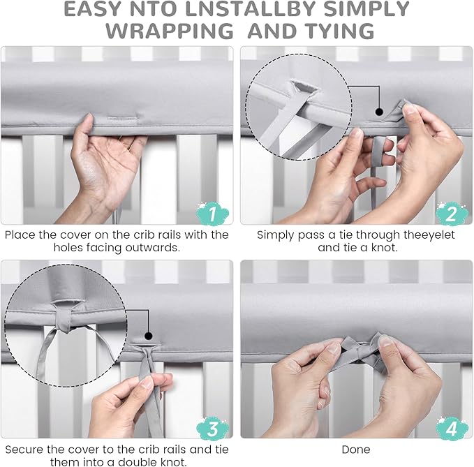 - 【Easy to use】: Easily installed in seconds, our crib railing cover is designed for quick and easy installation, saving valuable time for busy parents. Cover the top guardrail with the free side facing out, then pass a strap through the small hole, fasten the two straps tightly and tie a knot, and the crib rail protector is ready to use!