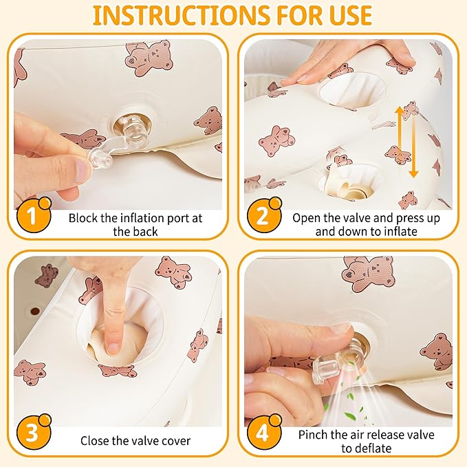 - Easy to Use, and Portable: The inflatable baby seat can be easily inflated within 3 minutes by pressing the built-in air pump up and down. Due to the leak-proof design, it is necessary to pinch the air valve when deflating. After deflating, fold it back to a small size for putting away, which is perfect for trips to the beach, camping or park.