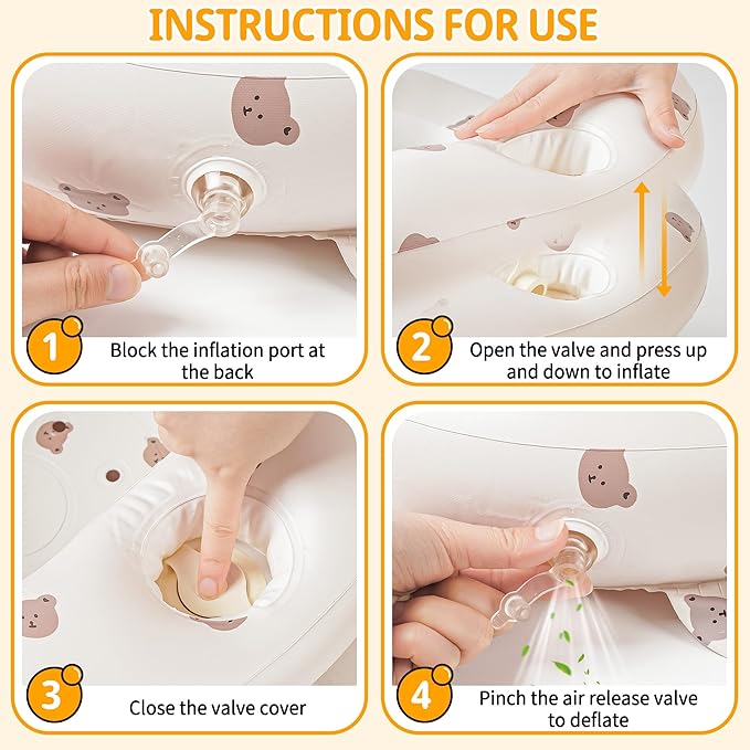 - Easy to Use, and Portable: The inflatable baby seat can be easily inflated within 3 minutes by pressing the built-in air pump up and down. Due to the leak-proof design, it is necessary to pinch the air valve when deflating. After deflating, fold it back to a small size for putting away, which is perfect for trips to the beach, camping or park.
