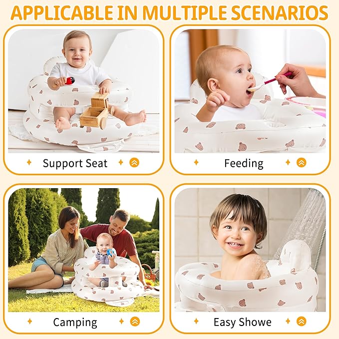 Inflatable Baby Seat for Babies 3-36 Months, Baby Chair with Fence & Built in Air Pump, Blow Up Floor Baby Seat with Back Support, Baby Sit Up Chair for Home, Travel (Bear-Large)