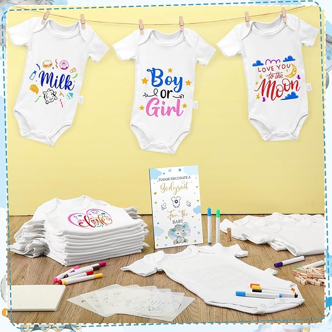 - Enjoy the DIY: this bodysuit baby shower game set allows you to enjoy the fun of DIY, choose your favorite pattern, use your imagination on white clothes; Not only can you get special baby bibs set, but also send the best wishes to babies