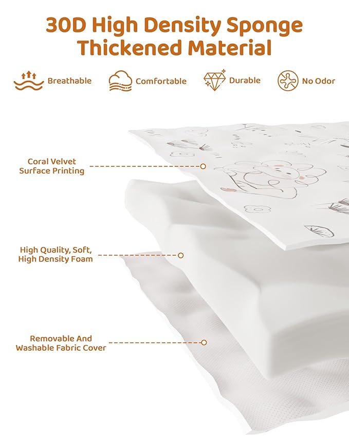 - 【Thicker and Softer Premium Foam】 Our baby play mats for floor are thicker than most other brands on the market. Filled with high-quality, non-toxic 1.2-inch thick slow rebound memory mat (0.8-inch thick foam); made from 100% coral fleece material, it's skin-friendly and offers a comfortable touch, providing your little ones with a cozy spot to relax, play, and develop their skills.