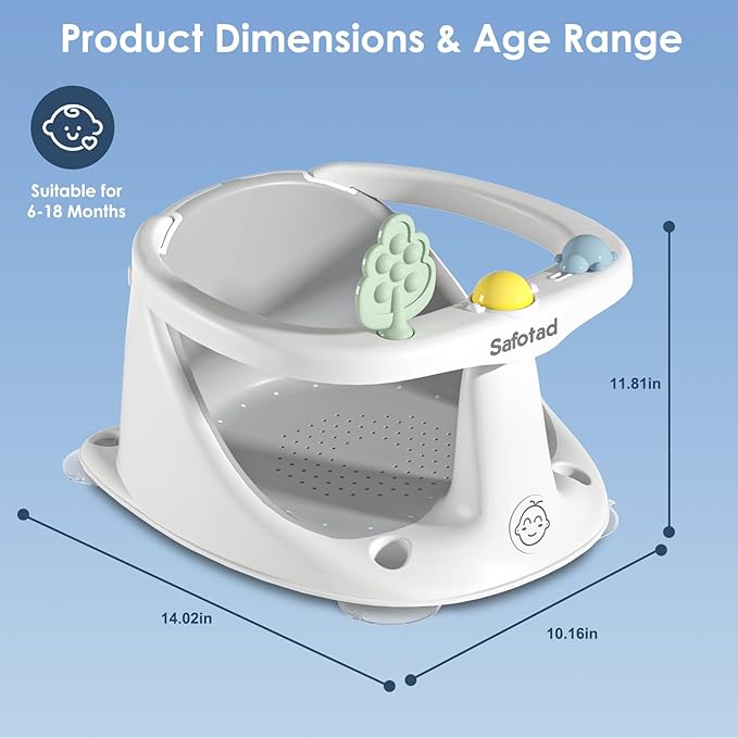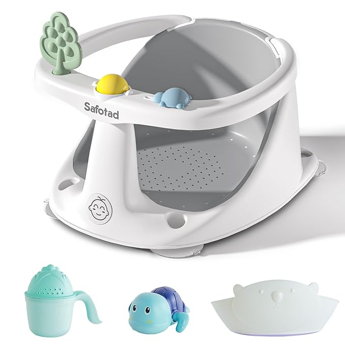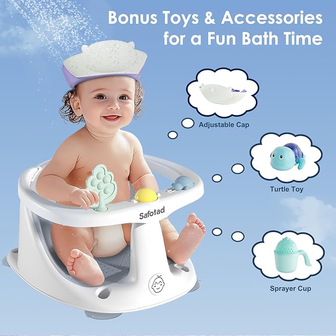 - Bonus Bath Accessories Included: This baby bathing chair comes with thoughtful bonus accessories to make bath time more enjoyable and convenient. The set includes a soft and protective bath cap to keep water and soap out of your baby’s eyes, a water scoop for gentle rinsing, and a cute turtle bath toy that will keep your little one entertained while bathing. These additions turn bath time into a joyful bonding moment for you and your baby. Ideal as a baby bath chair or sit up bathtub seat for baby.