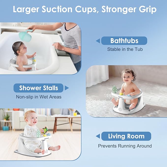 - Strong Suction Cups for Stability: The baby tub seat is equipped with four durable suction cups that provide exceptional stability by securely adhering to the bathtub surface. These strong suction cups ensure the bath chair baby stays firmly in place, preventing accidental slips or movement during use. This design prioritizes your baby's safety and allows parents to focus on creating a fun and relaxing bath experience without worry. A trusted bathtub seat for baby.