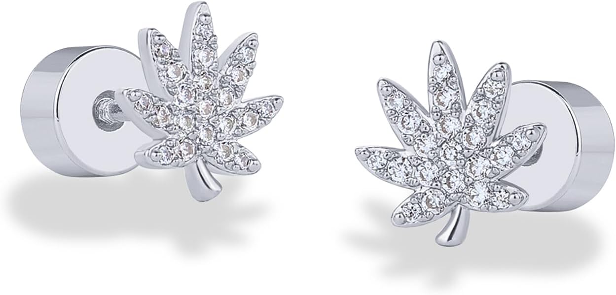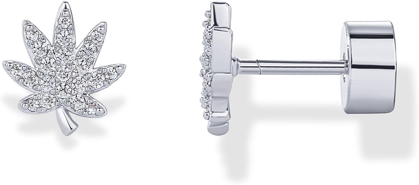 - HIGHLIGHTS: Show off your love for relaxing in these 7mm x 6.6mm leaf-shaped stud flatback earrings. This pair is rhodium plated and features small cubic zirconia stones with a sterling silver posts screw back.