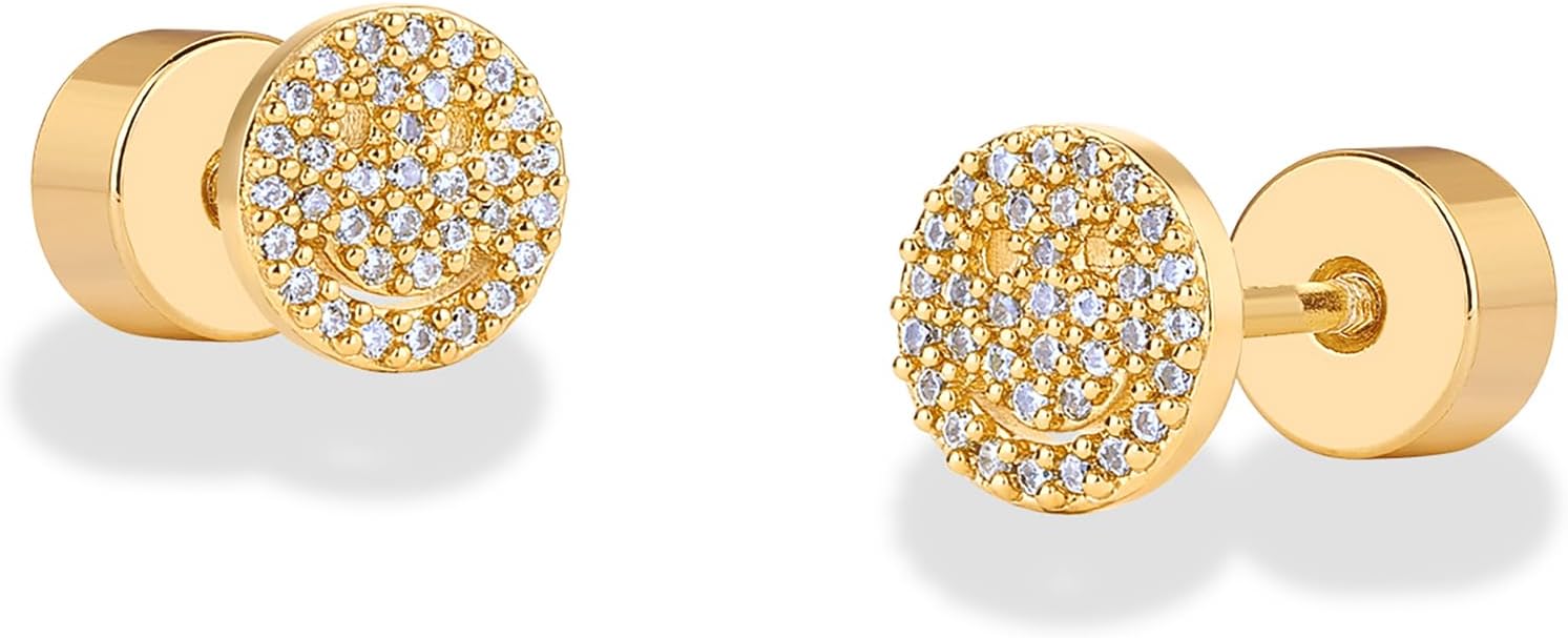 - HIGHLIGHTS: Don't worry, be happy. And wear it, too. Wear your biggest smile with this 6mm stud flatback earring pair featuring 14K yellow gold plating, premium cubic zirconia stones, and screwback posts.