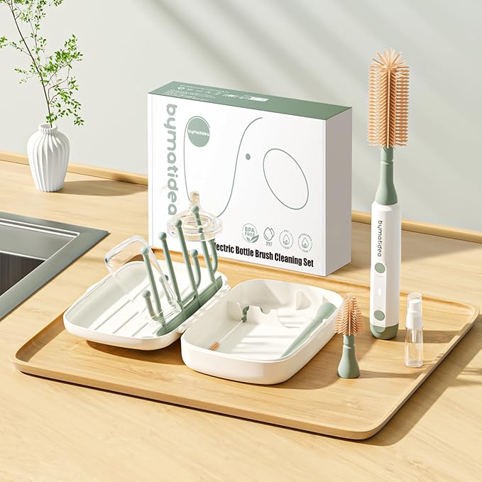 - 【360° Effortless Cleaning Tool】This 8-in-1 baby bottle brush set includes an electric brush handle, bottle brush head, nipple brush, drying rack, straw cleaner, soap dispenser, formula mixer, and storage box. Designed to effortlessly clean baby bottles, sippy cups, and pump parts; the electric baby bottle brush cleaner ensures thorough and efficient preparation of milk, making it a must-have for parents.