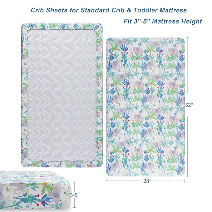TILLYOU Baby Crib Sheets for Boys Girls, Super Soft Toddler Bed Sheets, 2 Pack Sheets for Standard Crib Mattress 28x52in, Rainforest Elephant