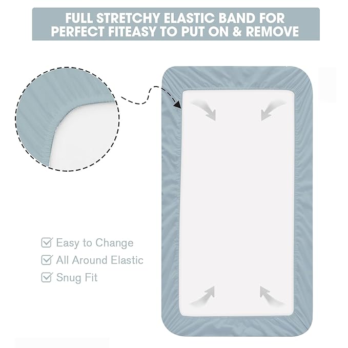 - QUICK AND EASY SETUP: Each item is enchased with a full elastic band making the baby sheets easy to put on and off your crib mattress. The durable band around the entire edge keeps crib sheets safely in place and prevent slipping away when sleeping, so you don't need to adjust the toddler sheet frequently!