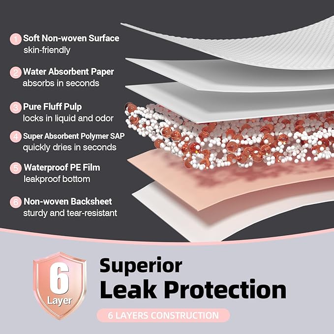 - 6-Layer Leakproof Design for Ultimate Protection: Featuring a 6-layer construction, these chucks pads effectively absorb and prevent liquid leakage, keeping your mattress and sheets dry