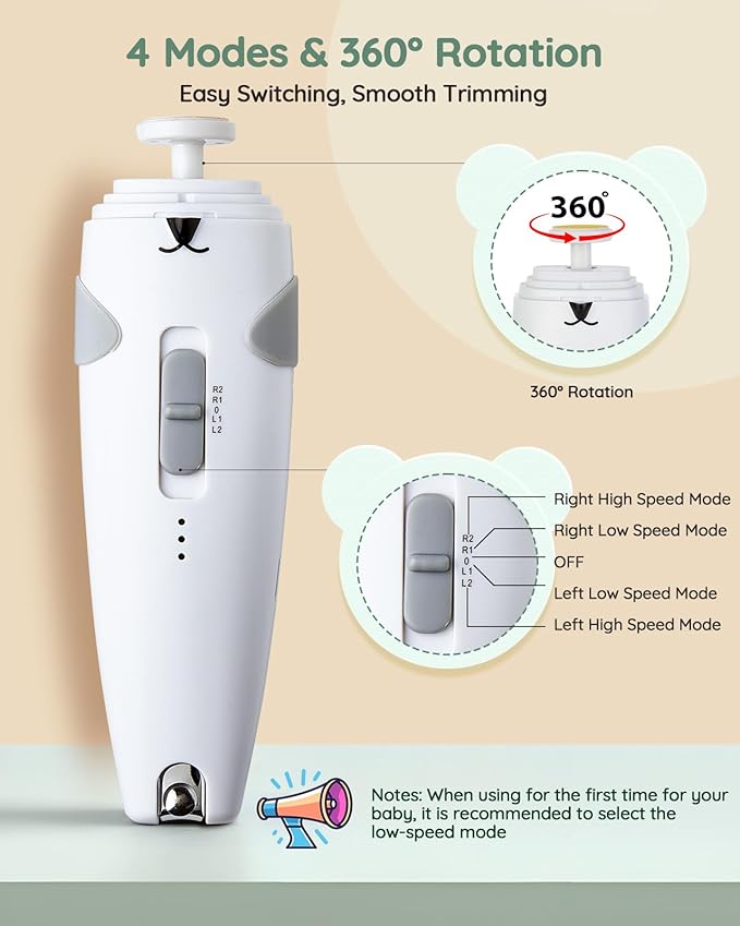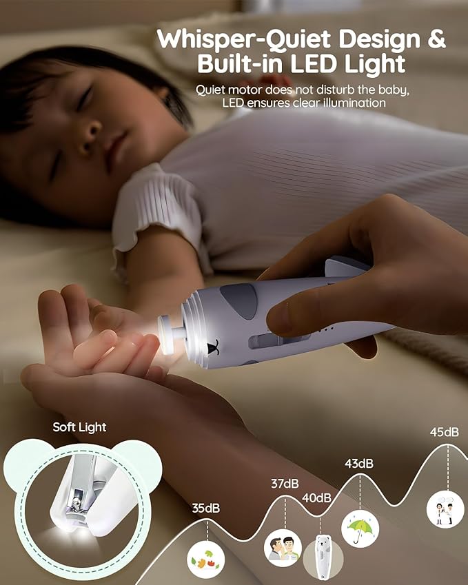 - Whisper-Quiet Operation for Comfort: Experience a peaceful nail trimming session with our electric nail file. Operating at a whisper-quiet 35-45dB, it ensures minimal disturbance to baby. The low noise level is perfect for sensitive ears, making it easy to maintain hygiene without causing any upset. Keep your little ones calm and comfortable during grooming