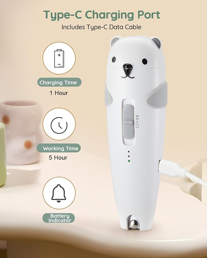 - USB-C Rechargeable: Go green with our USB-C rechargeable nail file baby. A single charge of just one hour gives you up to five hours of continuous use. Choose between two speed settings - 5000rpm or 6000rpm - catering to different needs within the family. Say goodbye to disposable batteries and hello to a more sustainable lifestyle