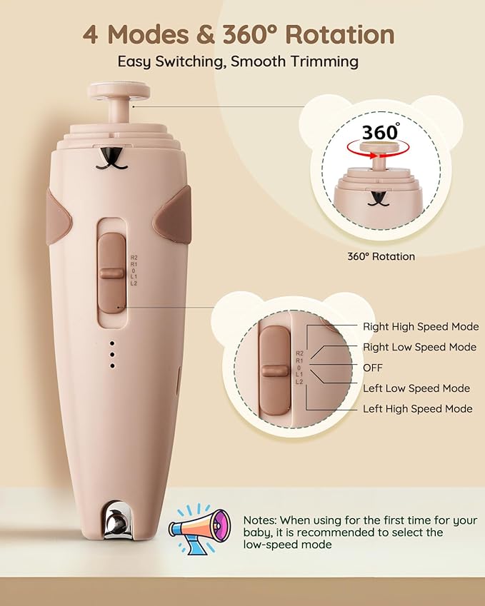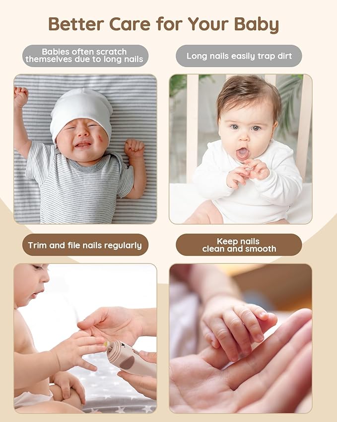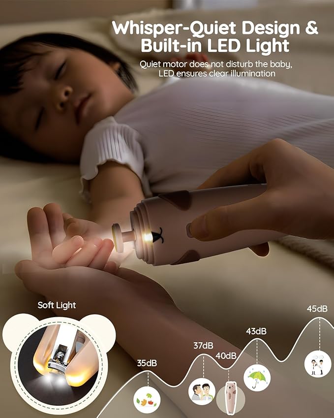 - Whisper-Quiet Operation for Comfort: Experience a peaceful nail trimming session with our electric nail file. Operating at a whisper-quiet 35-45dB, it ensures minimal disturbance to baby. The low noise level is perfect for sensitive ears, making it easy to maintain hygiene without causing any upset. Keep your little ones calm and comfortable during grooming