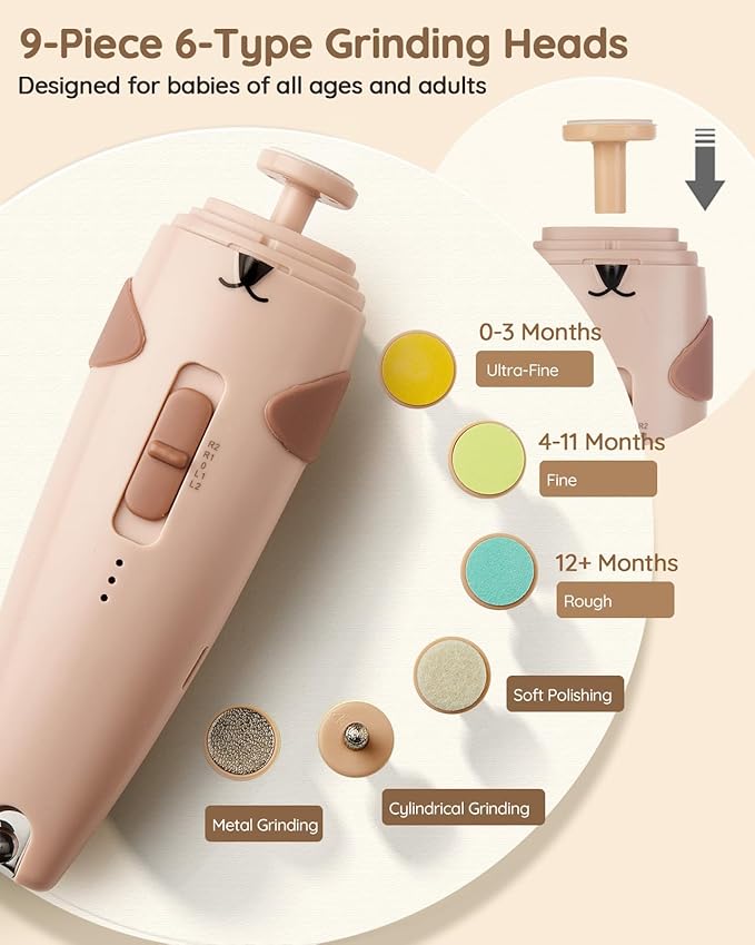 - Versatile Grinding Heads: Equipped with six types of grinding heads, totaling 9 pieces, this baby healthcare and grooming kit is suitable for everyone from newborns to adults. As your child grows, simply switch to a larger head, ensuring effective and gentle nail care throughout all stages of life