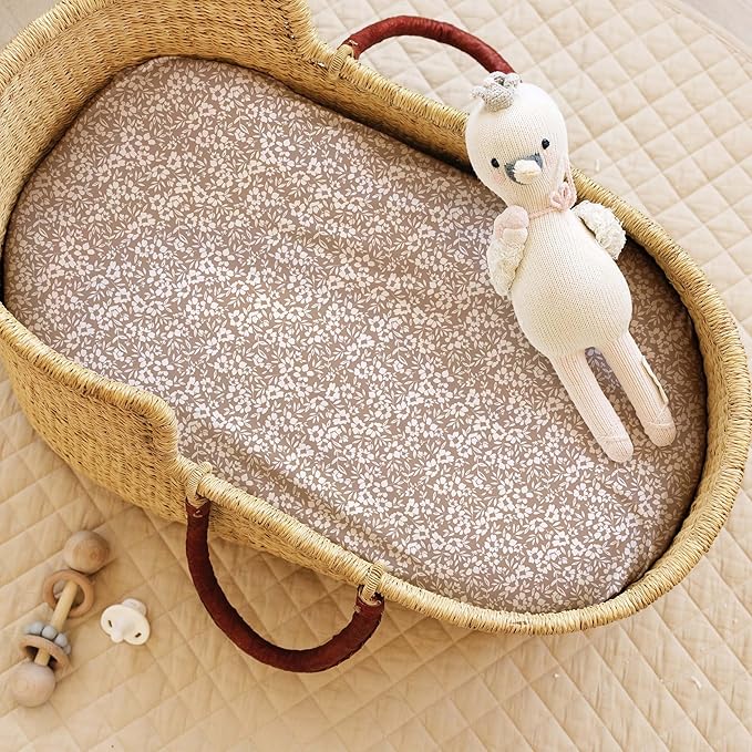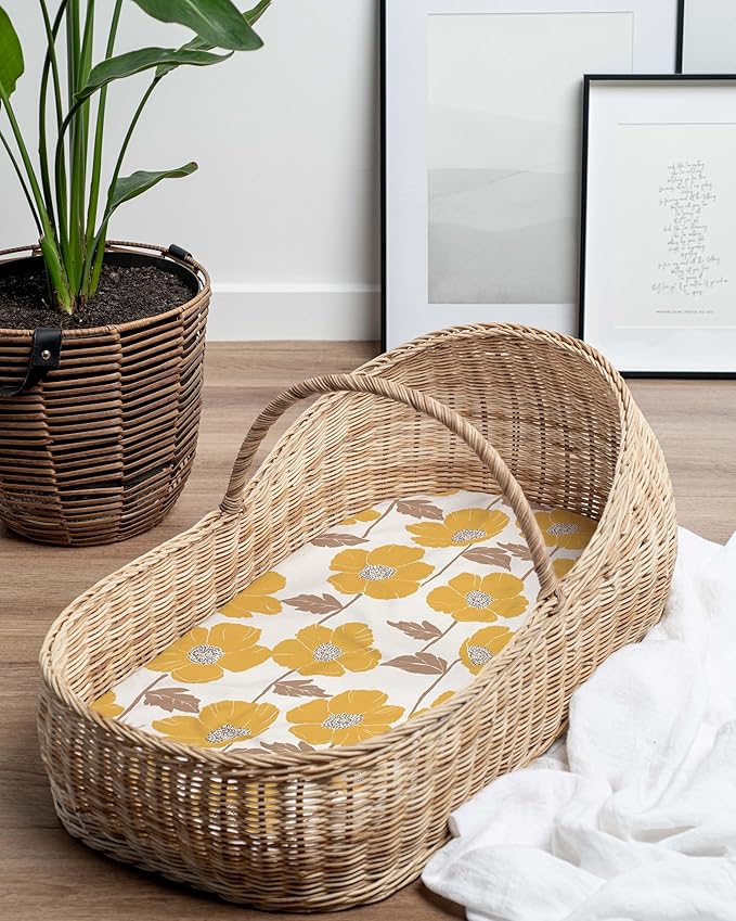 - 🌻 BEAUTIFUL DESIGN, UNBELIEVABLY SOFT MATERIAL – This beautiful custom pattern is printed on the most luxuriously premium organic cotton blend. Thicker elastic and deeper pockets ensure that our bassinet mattress sheets will NOT slip off the mattress pad. You’ll feel the soft, yet stretchy and silky material as you pull the sheets and snug, creating a safe and soothing space for your baby to sleep.