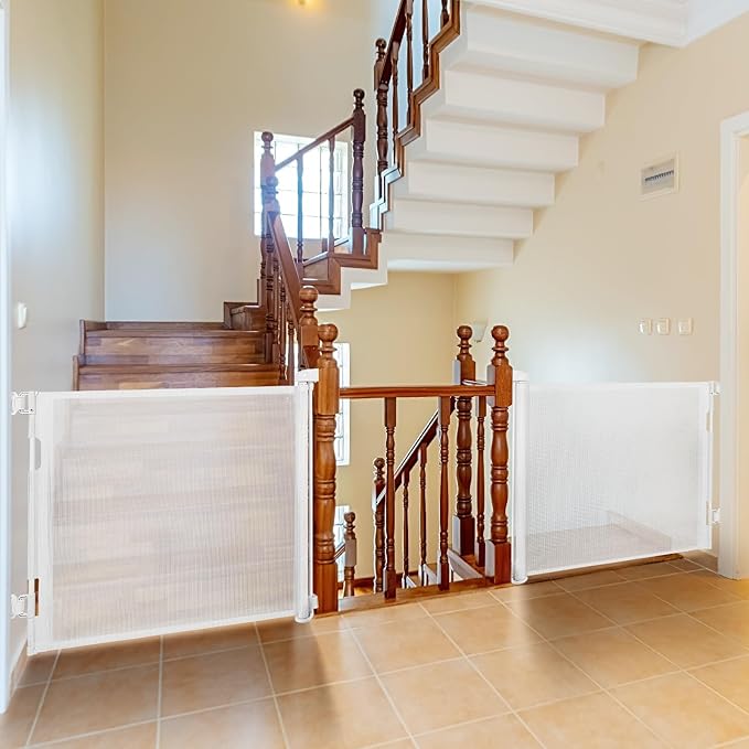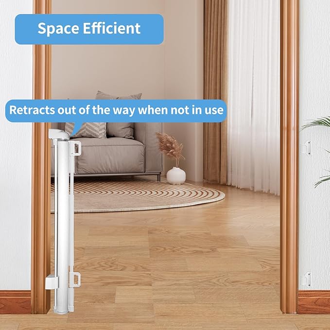 - EASY INSTALLTION :Can be installed at top and bottom of stairways, doorways, hallways, indoor and outdoor use. includes components for easy installation.You will get: Retractable mesh gate x1, Bracket x2, Latches x2, Wall anchors x8, Screws x8, Instructions x1,using the tools provided, you can get a new and safe child gate installed in minutes.