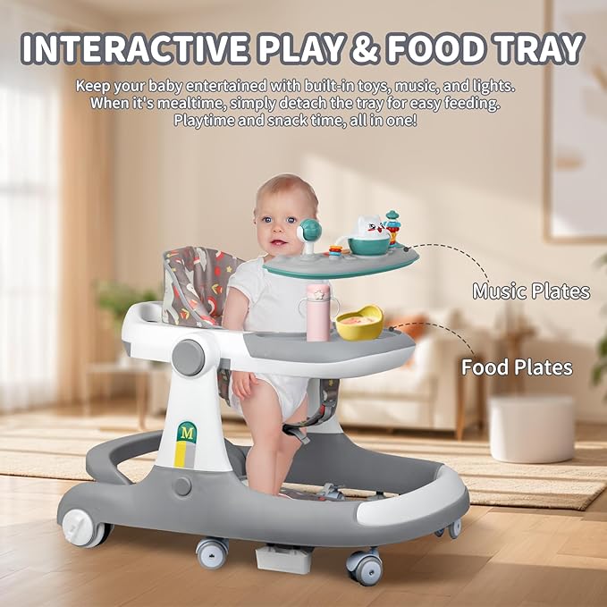 - 【Multifunctional walker】The music disc design is to attract the baby's attention, and the silent wheels design avoids noise. There are various entertainment games on the walker panel: rotating gears and stars, shape classifier, hammering game, perfect to meet the needs of mother. Remove the music disc and it can be turned into a baby dining table.