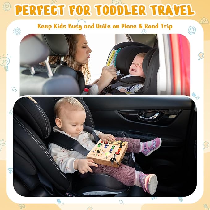 Busy Board with Led Light, Montessori Toys for 1-3 Years Old Boys Girls Wooden Toddler Toys Birthday Gift Educational Toys for 1+ Year Old, Toddler Travel Toy Sensory Toys for Kids with Autism