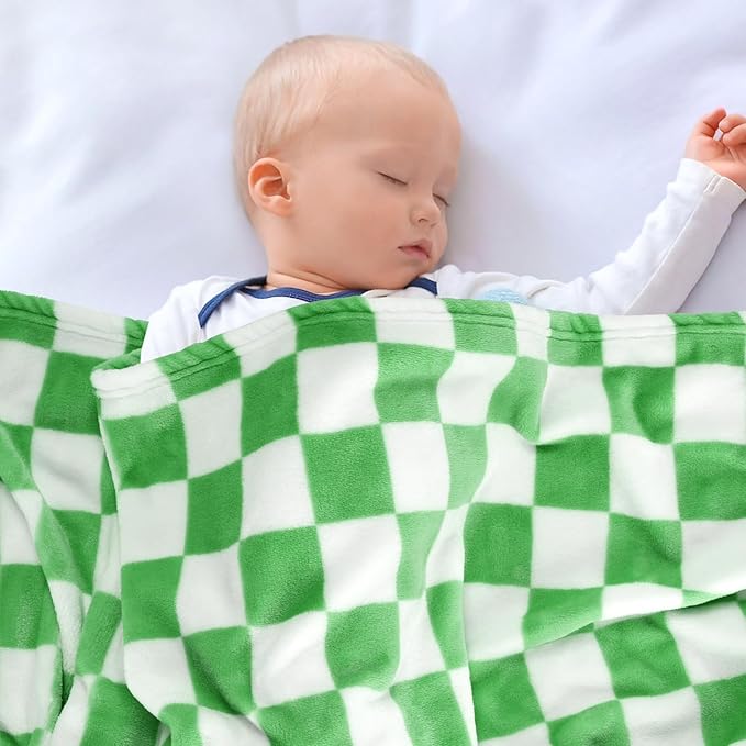 Plush Checkered Baby Blanket for Boys Girls Nursery, 30"*40" Warm Short Fleece Blanket Neutral for Infant Newborn, Small Fuzzy for Sleeping, Chenille or Stroller (Green&White)