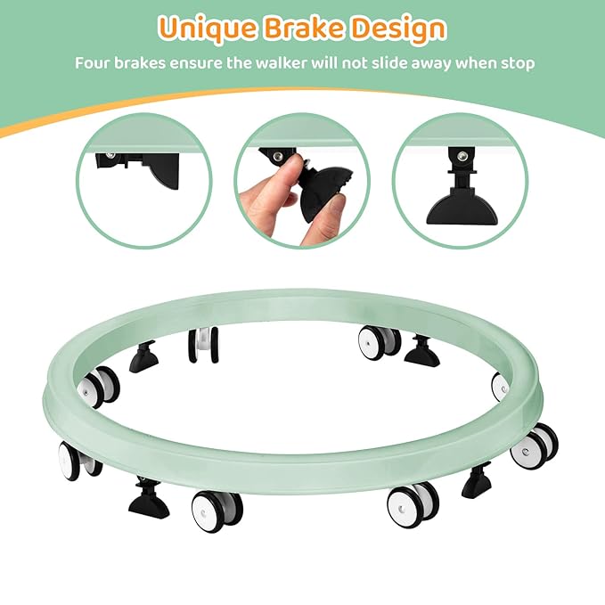 - 【Universal Wheels & Brake Design】Walker for baby is equipped with 8 wheels and 4 parking brakes. With universal wheels, the baby can move 360° easily. In addition, you can put down the brakes when needed, the walkers for babies 6-12 months can be turned into a fixed activity center. Universal wheels provide fun entertainment for babies, brakes provide a safer eating environment, and they making it easier for parents to take care of your baby