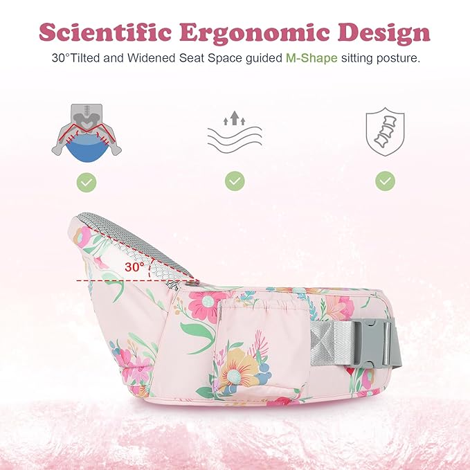 - Ergonomic Design: The wider and thicker waistband provides excellent lumbar support, evenly distributes the child's weight and reduces the strain on the arms and lumbar. 30-degree angled seat brings the infant closer to the parent, ensuring a safe and comfortable carry, maintains baby’s hips in an ergonomic "M" position