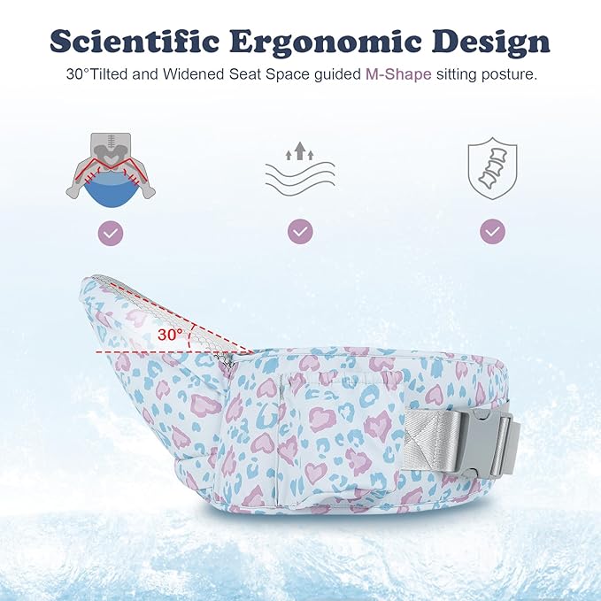 - Ergonomic Design: The wider and thicker waistband provides excellent lumbar support, evenly distributes the child's weight and reduces the strain on the arms and lumbar. 30-degree angled seat brings the infant closer to the parent, ensuring a safe and comfortable carry, maintains baby’s hips in an ergonomic "M" position