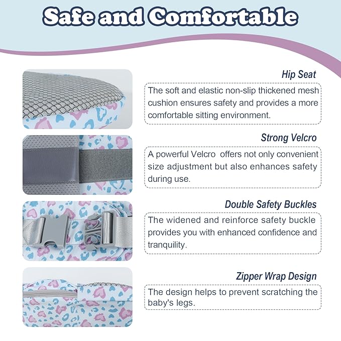 - Comfortable & Sturdy: Baby holder on hip using high-quality polyester fabric, soft and skin-friendly, sturdy and not easy to deform, zipper wrap design helps to prevent scratching the baby's legs, thickened mesh padding in the seat area, cozy and breathable