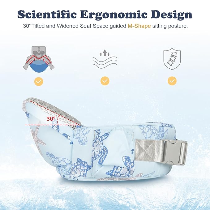 - Ergonomic Design: The wider and thicker waistband provides excellent lumbar support, evenly distributes the child's weight and reduces the strain on the arms and lumbar. 30-degree angled seat brings the infant closer to the parent, ensuring a safe and comfortable carry, maintains baby’s hips in an ergonomic "M" position