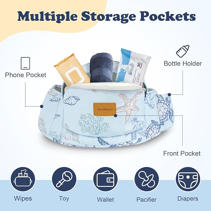 - Multiple Pockets: Toddler hip carrier features multiple storage pockets help to carry baby essentials when you out. Storage space under the seat for baby diapers and wipes. Keys and cell phone can be stored in the right side pocket and the left side organizer can store bottles