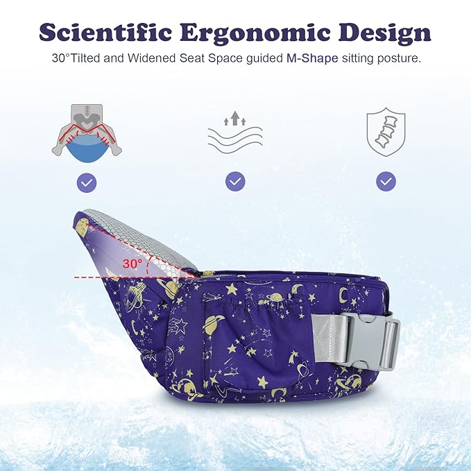 - Ergonomic Design: The wider and thicker waistband provides excellent lumbar support, evenly distributes the child's weight and reduces the strain on the arms and lumbar. 30-degree angled seat brings the infant closer to the parent, ensuring a safe and comfortable carry, maintains baby’s hips in an ergonomic "M" position