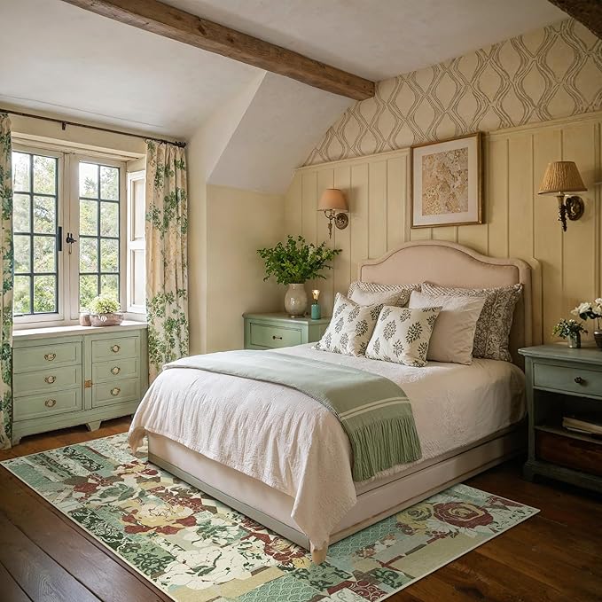 GENIMO 5X7 Floral Area Rugs for Living Room, Machine Washable Non Slip Vintage Patchwork Washable Rug, Ultra-Thin Low Pile Chenille Rugs for Bedroom, Dining Room, Celadon Green