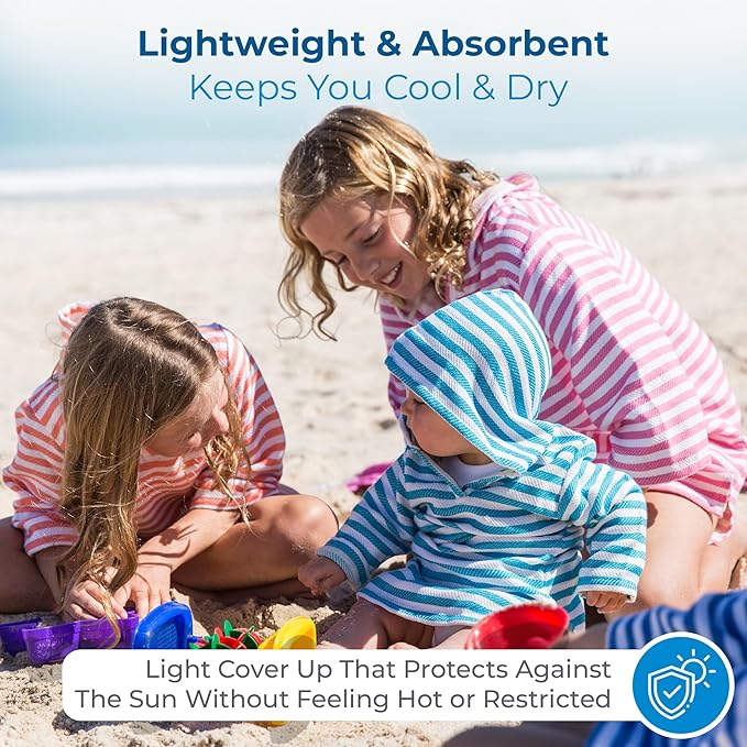 - PULL ON & GO - This swimsuit cover up and bathrobe is light and breathable which makes it a great kids bathrobe and beach towel for those times of year when you need to stay dry and cool
