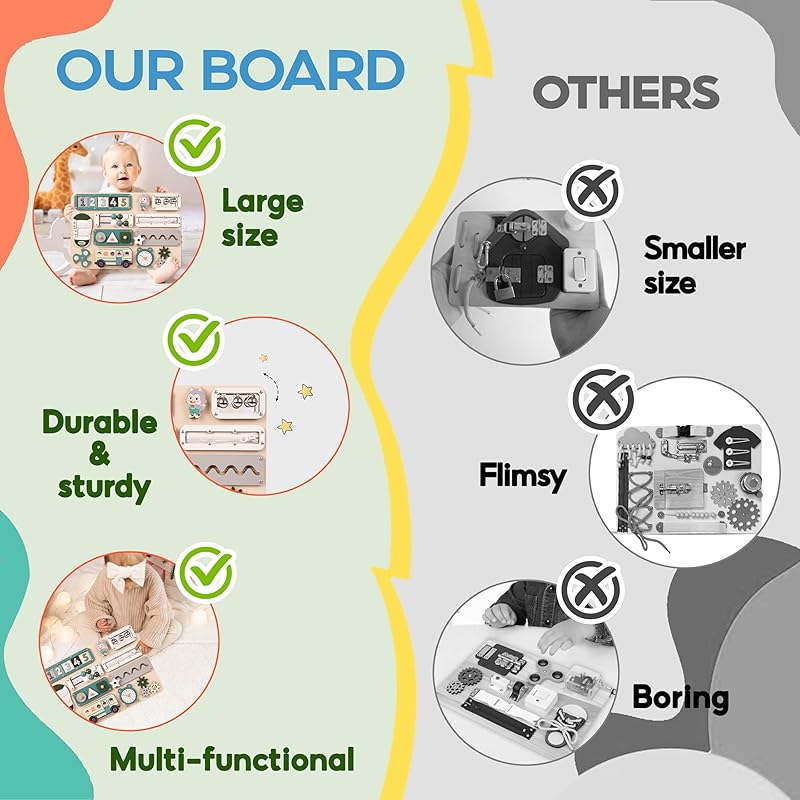 - 【Customer Satisfaction Guarantee】 We stand by the quality of our products and continuously strive for improvement. Your purchase is backed by our guarantee, and we encourage you to reach out with any questions or concerns. Our commitment is to provide you with a satisfactory solution, ensuring your experience with our baby busy board is nothing short of delightful.