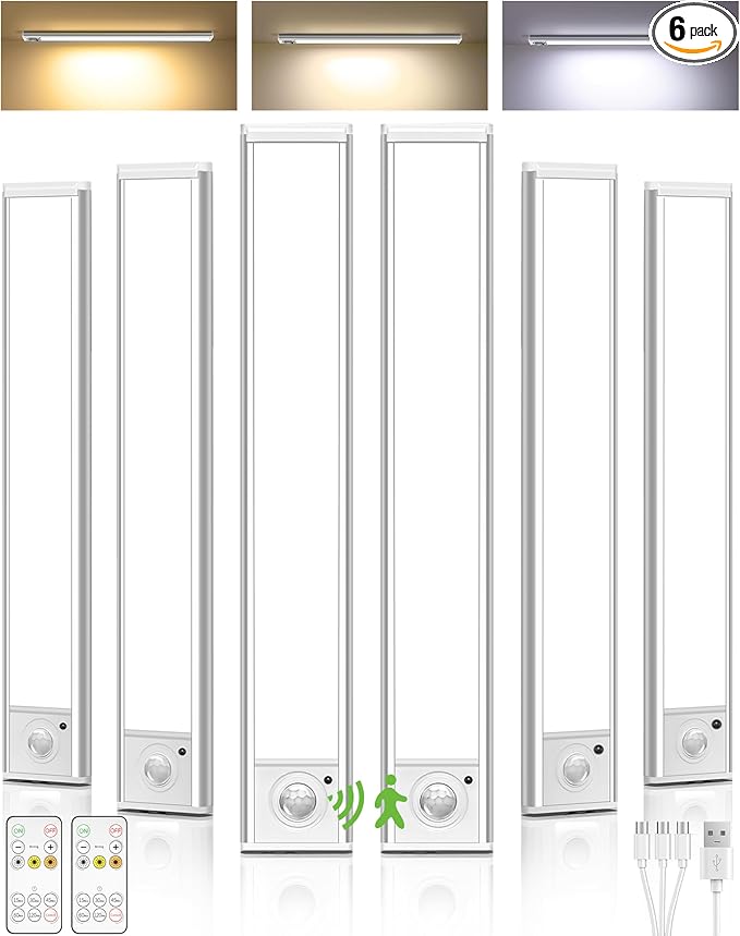 Under Cabinet Lighting,LED Rechargeable Motion Sensor Light Indoor Battery Operated,3 Color Temps&Dimmable Closet Lights with Remote,Wireless Under Counter Lights for Kitchen Stairs (6 Pack)