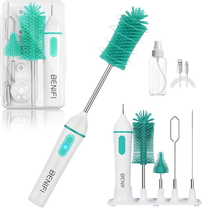 Travelling Electric Bottle Brush Cleaner, Baby Bottle Brush Set, Fully Water -Proof Bottle Brush, Long Handle Brush, BPA Free Silicon Brush Heads, Drying Stand, Milk Mixer, Egg Whisk Included
