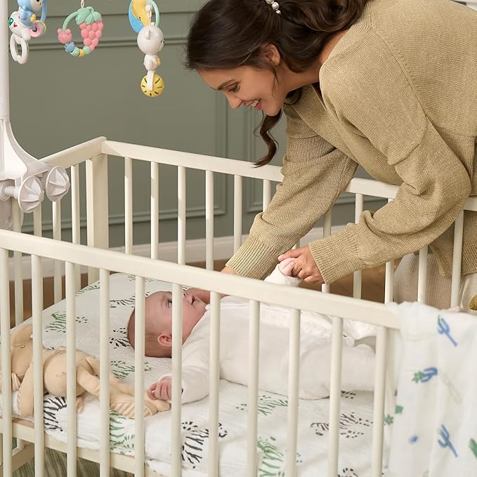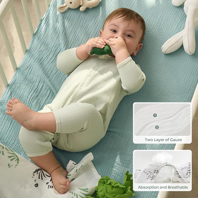- 【Baby Sleep Soundly with Moisture-Absorbent and Breathable Fabric】Breathable and lightweight double-layer gauze boys and girls mattress crib sheet let baby breathe through bed sheet and mattress, allows for proper air circulation and doesn’t trap heat to help regulate baby's body temperature while they sleep. Absorbs extra moisture in the air promptly to keep baby body fresh and dry, suitable for all seasons, warm in winter and no hot sleeping in summer.