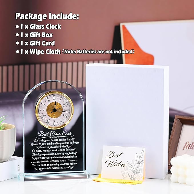 - Dazzling Centerpiece - The glass clock for boss is not only a personalized clock gift, but also a stylish home decor piece that can be placed anywhere in the home, such as desk, bookshelf, tea table, dresser, fireplace, nightstand, cabinet, or display, which is both cozy and meaningful. (Tips: The lovely words is white in the glass, the effect will be better if put it before a dark background)