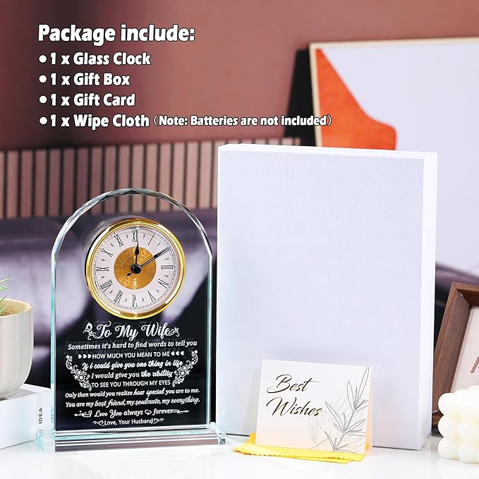 - Clock Gifts for Wife - Celebrate your cherished wife with this lovely crystal clock, perfect for every milestone in her life—Valentine’s Day, anniversary, birthday, wedding, Christmas, and more. Every etched word reflects a husband’s unwavering devotion, offering her daily reminders of your love, strength, and confidence in her. Like the flawless crystal, your bond remains pure, unbreakable