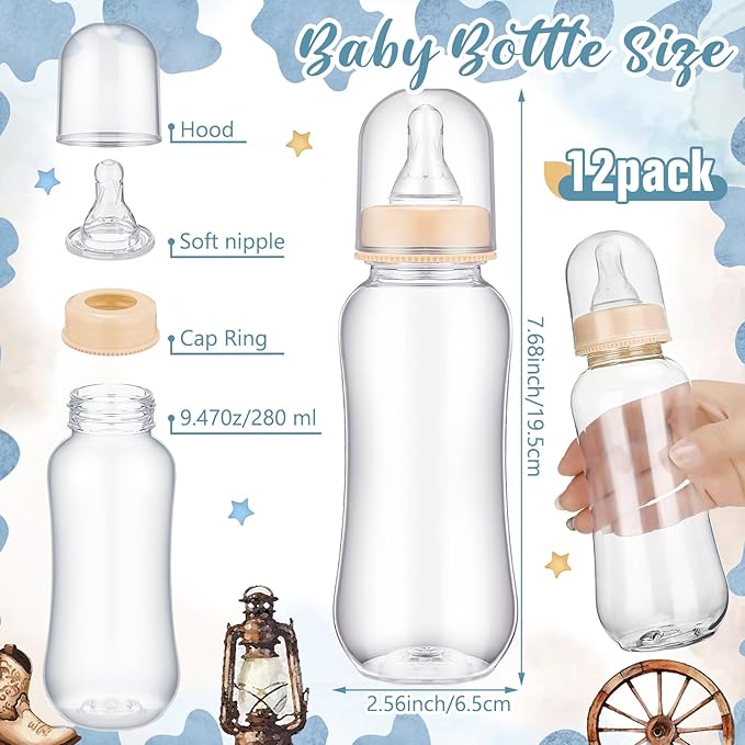 - Detailed Size: the Western Theme game sign measures about 5.12 x 7.87 x 0.2 inches, and the plastic baby bottles for baby shower has a height of 7.68 inches, a bottom diameter of 2.56 inches, and hold up to 9.5 oz/ 280 ml of liquid; The detailed size of all components ensures that they are fit for purpose and will work well in any baby shower setting